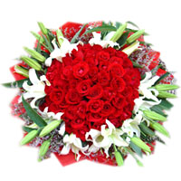 商品簡介:9支香水百合、66支紅玫瑰、情人草