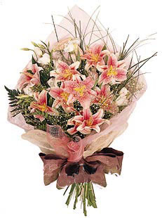 商品簡介:雙頭香水百合6朵、綠葉、情人草