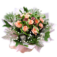商品簡(jiǎn)介:【花材】 花束: 12支粉玫瑰+滿天星+配葉,淡紫色皺紋紙圓形包裝,淺粉色絲帶束扎