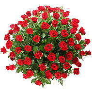 商品簡介:66枝靚麗紅色玫瑰。藤編花籃圓形插花,紅色蝴蝶結裝飾。
