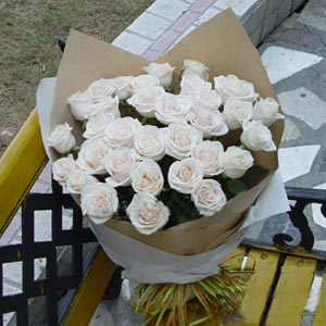 33枝白玫瑰、綠葉適量 。 淺色皺紋紙、土黃色皺紋紙、玻璃紙