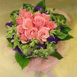 12枝粉玫瑰,葉上花、勿忘我、綠葉適量 包 裝: 圓形花束,透明玻璃紙包裝,粉色絲帶包扎
