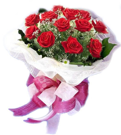 商品簡介:紅玫瑰12枝,滿天星、綠葉豐滿 包 裝: 淡紫色卷邊紙圓形圍裹,白色紗內(nèi)襯,紫色蝴蝶結(jié)束扎