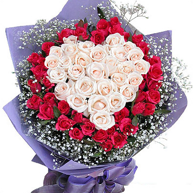 | 材料包裝: | 白玫瑰33枝搭配成心形,紅玫瑰33枝圍繞白玫瑰四周包 裝: 紫色皺紋紙圓形包裝,同色絲帶束扎 ,外邊滿天星環繞,配適量綠葉,備注:玫瑰顏色根據貨量可做適當調整.
