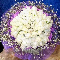 包裝:白玫瑰99枝,勿忘我、滿天星圍繞,淡紫色紗網(wǎng)圓形包裝。