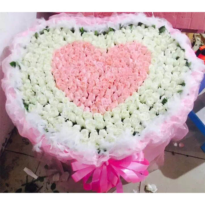 粉玫瑰,白玫瑰共999朵,滿天星、梔子葉搭配,白色羽毛圍繞,粉色手揉紙,粉色細軟紗,紅色蝴蝶結裝飾。