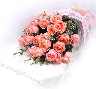 商品簡介:18枝粉色玫瑰、水晶草、綠葉適量,粉色皺紋紙、港式花結