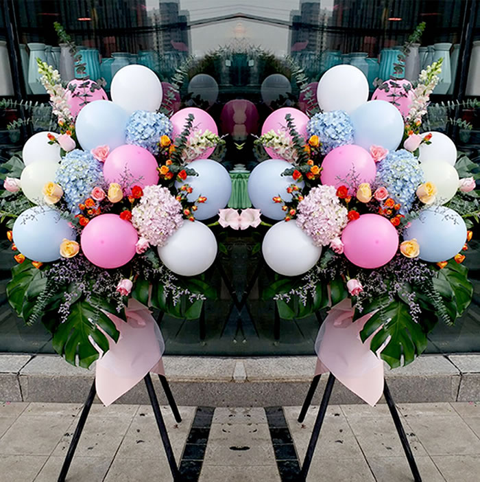商品簡介:粉繡球,藍繡球,各色氣球,戴安娜玫瑰,香檳玫瑰,紫羅蘭,尤加利,龜背葉,情人草,直徑60CM,高度170CM