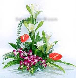 商品簡介:花材包裝:鐵炮百合4枝,蘭花6枝,火鶴2枝,綠葉適量,花泥,竹編花籃一只