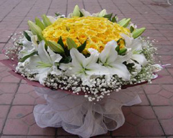 商品簡介:36支黃玫瑰,8支白色香水百合,配滿天星豪華包裝