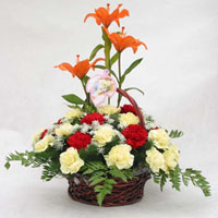 商品簡介:簡 介: 工藝手提花藍:紅百合3朵,紅、黃康乃馨共56支,配蕾絲花和襯草