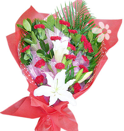 商品簡(jiǎn)介:16枝紅色康乃馨,1枝香水百合(多頭),散尾葉