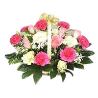 包裝:粉色康乃馨10枝,白色玫瑰5枝,粉色玫瑰5枝,滿天星適量,配葉搭配。圓形有柄花籃