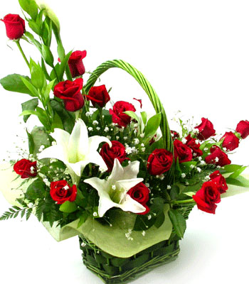 商品簡介:20枝紅玫瑰,2朵鐵炮百合; 包 裝: 綠色培葉適量,滿天星點綴;手提竹編花籃一只