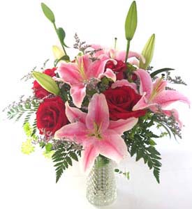 材料包裝: 【花 材】3枝多頭粉百合,5枝紅玫瑰,點綴情人草葉材作成精美的花瓶花插,精美玻璃花瓶一個