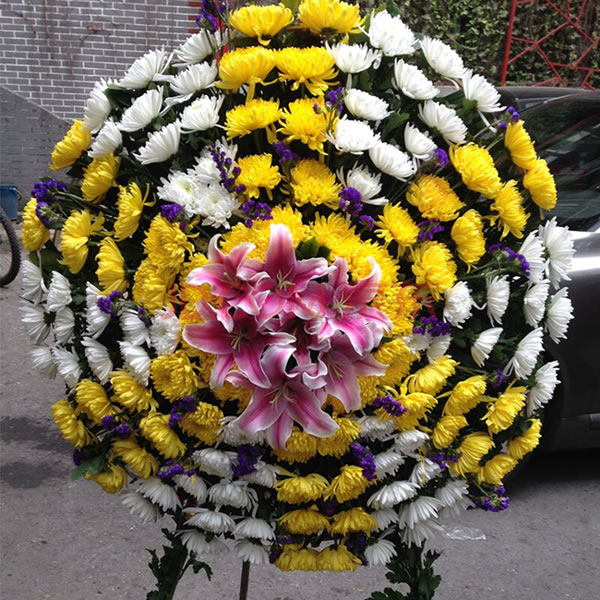 商品簡介:白菊花黃菊花粉百合組合哀悼花圈