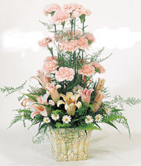 商品簡介:組 成: 36枝粉色康乃馨,4枝多頭粉色香水百合,小菊,綠葉 包 裝: 精致方形花籃包裝