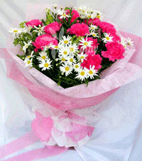 簡 介: 紅色康乃馨19支,小翠菊若干。淺紅色包裝紙束扎成圓形花束,內(nèi)襯淺色綿紙,絲帶花束扎。