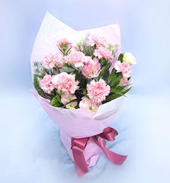 | 材料包裝: | 簡 介: 粉色康乃馨11支,豐富葉材。多層淺色皺紋紙束扎成圓形花束,紫色鍛帶打結。