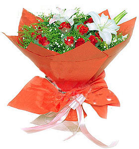 簡 介: 紅色康乃馨21枝,多頭白香水百合2朵,黃鶯豐滿,滿天星點綴。橙色皺紙紙束扎,圓形包裝,粉色蝴蝶結緞帶。