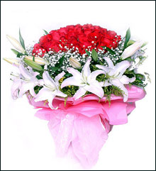 | 材料包裝: | 紅玫瑰66枝,10枝白色香水百合(多頭),滿天星豐滿,黃鶯豐滿圍繞,