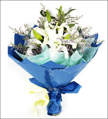 材 料] 白色多頭香水百合4枝,情人草適量 [包 裝] 韓式圓形包裝:淡綠色綿紙內包裝,深藍色棉紙外包裝,黃色絲帶系結。