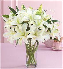 [材 料] 9枝昆明空運上等白色香水百合 [包 裝] 瓶插:采用高檔玻璃花瓶設(shè)計
