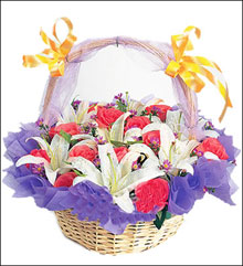 [材 料] 粉玫瑰12枝,半開的白百合6頭,紫色手揉紙折起做成小花,插于底部襯托 [包 裝] 花籃:藤編帶提梁花籃一只,蘭色網(wǎng)紗提梁包裹,黃色小花裝飾 規(guī)格:直徑:38CM