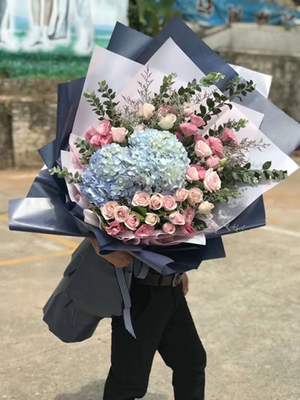 花材:2朵淡藍色色繡球花11朵白玫瑰11朵戴安娜11朵淡粉色玫瑰,情人草滿天星尤加利等配花搭配包裝 熊抱花束長度不低于1米