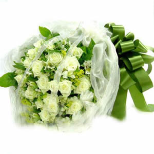 16只白玫瑰,黃色勿忘我或加拿大黃鶯和梔子葉搭配、白色沙網(wǎng)包裝,綠色絲帶打結(jié)。