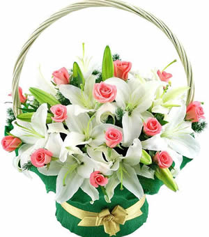 | 材料包裝: | 花 材: 8支多頭白色百合,18朵粉色玫瑰,配葉