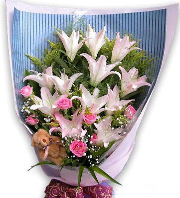 相關知識:清香的百合花搭配粉玫瑰和小熊,有著高雅中帶著可愛的 氣息,就如同她一般,凡走過必留下令人難忘的香氣。