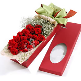 材料包裝: 花 材:24枝靚麗紅玫瑰,滿天星根部扎束豐滿 包 裝: 淡色皺紋紙西式包裝,紅色高檔禮盒、蝴蝶結(jié)緞帶裝飾