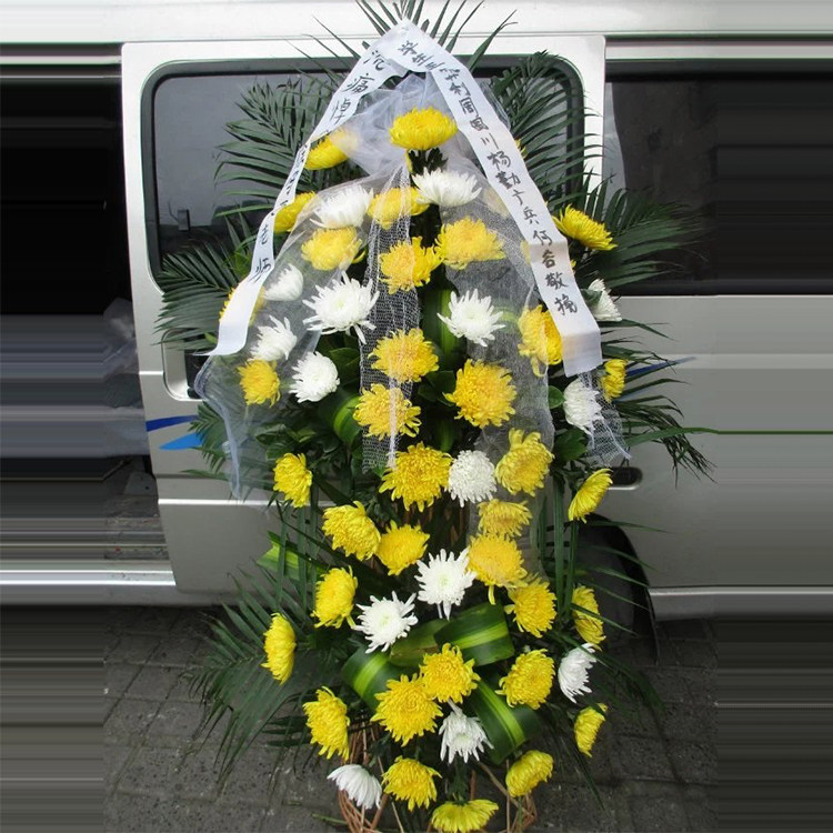 商品簡介:黃菊花白菊花綠葉搭配1米8高喪事花籃