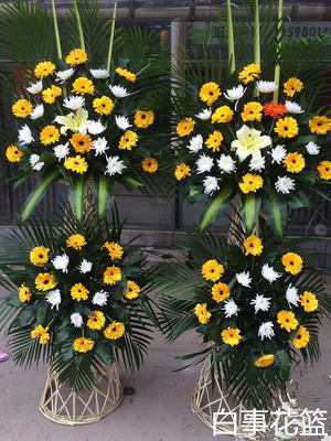 商品簡(jiǎn)介:白菊花黃菊花雙層喪事花籃1.8米高