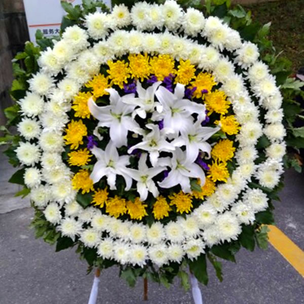 商品簡介:白菊花黃菊花白百合勿忘我搭配綠葉哀悼花籃