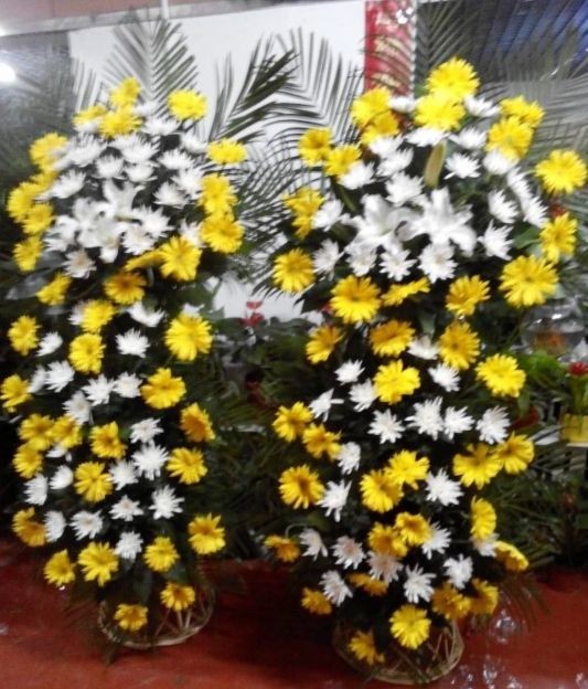 商品簡介:白菊花,黃菊花,白百合,1米8高哀悼花籃