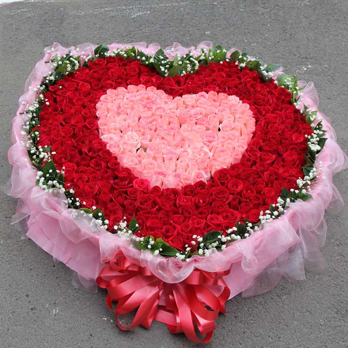 粉玫瑰,紅玫瑰共999朵,滿天星,梔子葉圍繞,粉色手揉紙,粉色細(xì)軟紗,紅色蝴蝶結(jié)裝飾。