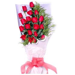 淡粉色卷邊紙,皺紋紙扇面包裝,紅色絲帶 19枝紅玫瑰,黃英