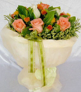 【花材包裝】:3枝白玫瑰,9枝粉玫瑰,綠葉、襯花點綴;香檳色紗網點綴。