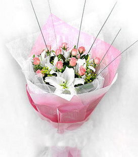 | 材料包裝: | 粉色玫瑰12枝,白色香水百合2枝,黃鶯點綴;玻璃紙內襯,粉色系包裝,扇形花束。