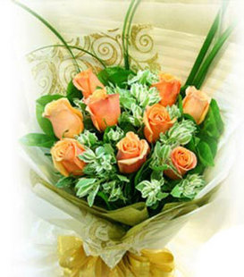 商品簡介:香檳玫瑰11枝,高山積雪、梔子葉點綴;金黃色棉紙包裝。