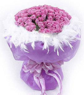 商品簡介:紫精靈玫瑰99支(特殊花材,請?zhí)崆坝嗁彛;紫色新娘紗圓形包裝,白色羽毛裝飾,法式蝴蝶結(jié)束扎。