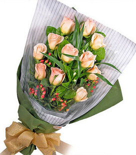 商品簡介:11枝香檳玫瑰,火龍珠點綴;銀色條紋紙,綠色棉紙包裝,扇形花束。