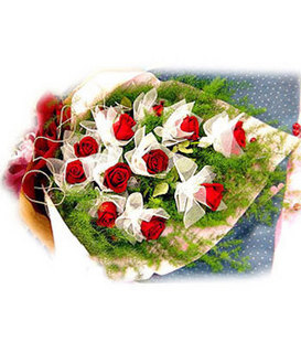 紅玫瑰11枝,單枝包裝,天門冬包裝;扇形花束。