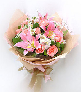 粉百合3枝,粉玫瑰11枝,水仙百合、桅子葉點綴;土黃色棉紙包裝。