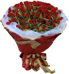 材料包裝: 【鮮花花材】99支紅玫瑰 點綴黃鶯等裝飾 【鮮花包裝】用白沙或玻璃紙內襯;紅色包裝紙圓型包裝 絲帶包扎