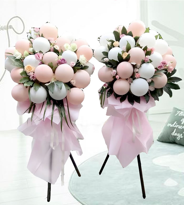 材料包裝: 粉氣球,白氣球,綠桔梗,紫桔梗,戴安娜玫瑰,香檳玫瑰,八角葉,富貴竹,散尾等,直徑60CM,高度170CM