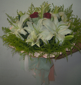 商品簡(jiǎn)介:【鮮花花材】12朵香水百合;2朵玫瑰;配草適量 【鮮花包裝】粉色卷邊紙圓形包裝,絲帶束扎