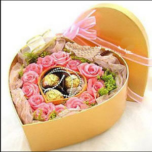 「材 料」三顆費列羅巧克力;外圍13支粉玫瑰成心 「包 裝」外圍黃櫻+粉色紗帶;心型禮盒包裝.